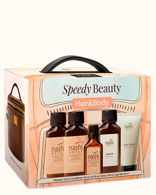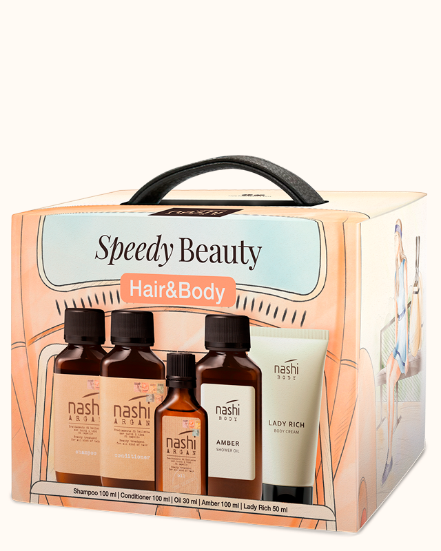 Speedy Beauty Hair & Body: Shampoo 100ml, Conditioner 100ml, Oil 30ml, Shower Oil 100ml, Daily Body Cream 50ml.